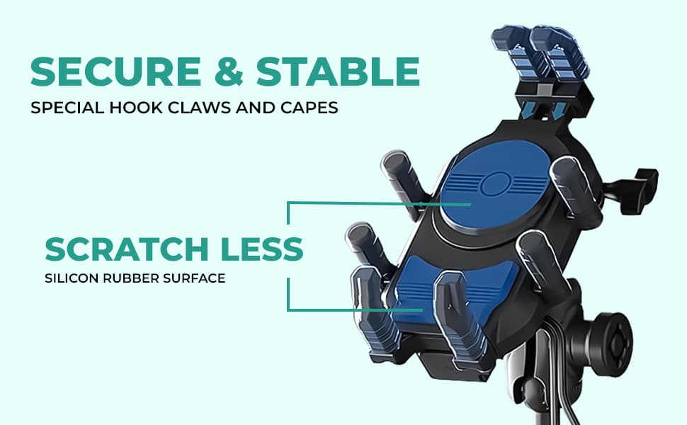 Ultra-secure four-arm grip with shock-absorbing silicone pads to keep your phone stable, even on bumpy rides. -